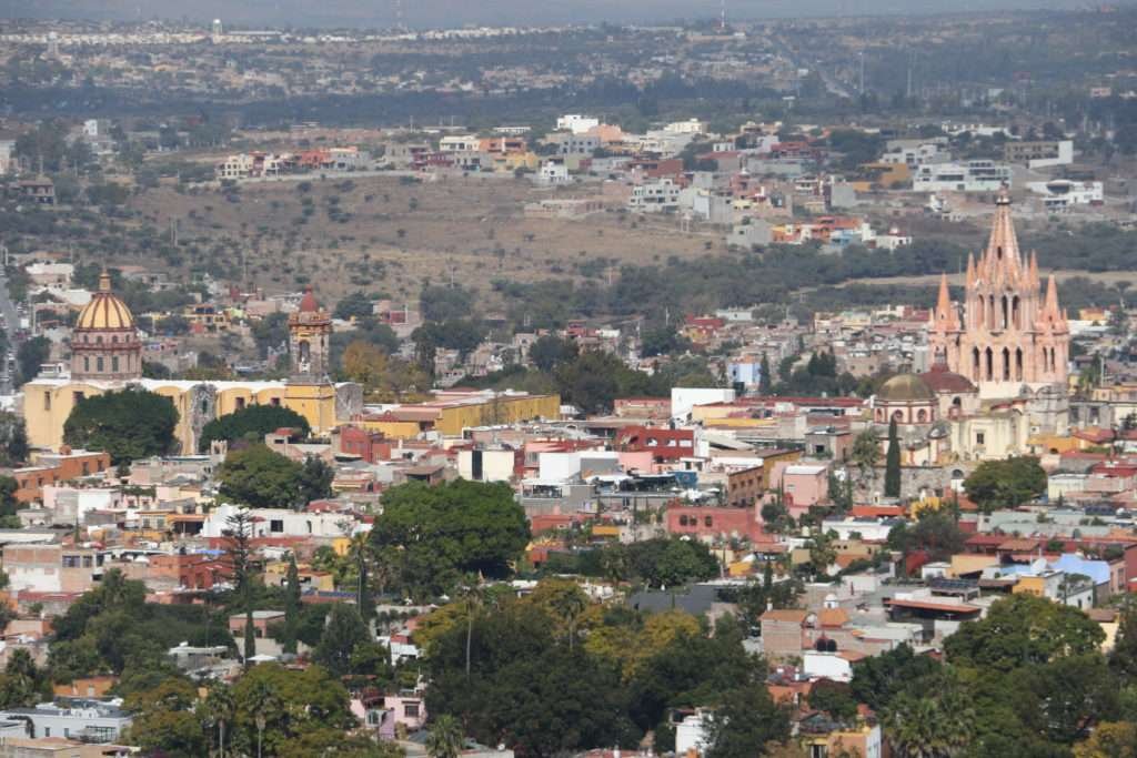 La historia suele estar repleta de ironías, muestras del devenir más o menos controvertido, del hombre en el mundo. Una de éstas se deja entrever cuando miramos el paisaje de la ciudad de San Miguel de Allende. Desde cualquier lugar que uno busque: el amplio Mirador del Caracol, alguna empinada calle de la colonia San José o la terraza de algún lujoso hotel, se observa una población de casas bajas, coloridas, con tonos verdes ajardinados, con pocas distorsiones que ha tomado las colinas y barrancas cercanas al ritmo de su éxito turístico y del crecimiento urbano detonado por éste. Se trata de una morfología más o menos homogénea delimitada por los cerros, por el casi oculto arroyo de los Cachinches, la presa del Obraje y la presa Allende que desde 1968 acopia las aguas del rio Laja. Esa homogeneidad que se nutre de un pasado colonial y un devenir en el siglo XX marcado por el desarrollo turístico, entendido como una forma distinta de encarar el supuesto desarrollo del milagro mexicano, se rompe gracias a dos elementos arquitectónicos que desde finales del siglo XIX son omnipresentes en el skyline sanmiguelense.